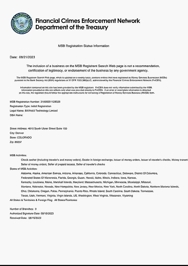 近日,来自币点宇宙的喜讯传来:旗下公司BXWeb3 Technology Limited已成功获得美国最权威的MSB金融牌照,为其金融业务合法运营添上浓墨重彩的一笔。这一成就标志着公司在合规领域迈出了坚实的一步,为未来的发展描绘了更加光明的前景。