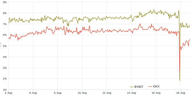 8 月 15 日至 8 月 18 日期间 BTC 暴跌 11.4%,与之前的情况明显不同。比特币期货溢价的起点较高,超过了5%的中性门槛。