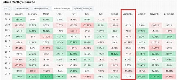检查上面的图表,很明显,九月份对比特币来说历来是一个充满挑战的时期。