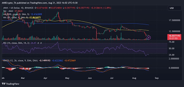 检查Avalanche的每日时间框架图可以发现,其价格的下跌始于 7 月份,尽管最大幅度的下跌发生在 8 月份。截至撰写本文时,该代币下跌了近 3%,交易价值徘徊在 10.5 美元左右。