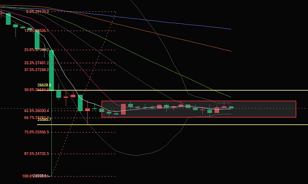 比特币技术面就无需过多的讲解,震荡就是震荡,暂时玩不出新花样,行情是步入一个小箱体,上下空间不多,只有三百多点,但是走的足够稳健,四小时布林带也是平稳运行,给当前修复行情给予一定的支撑,量能方面持续的缩量,没有量能,成交量低迷,震荡势必要进行一个延续,短期上方重要压制位26600,重要支撑位25600,现在价位处于中性价格,上可攻退可守