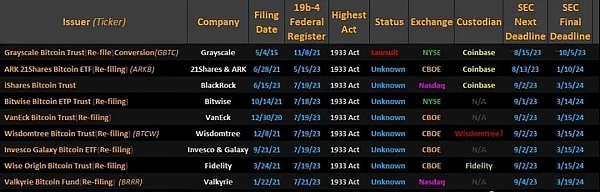 市场对比特币ETF何时获得批准的时间表非常关注。根据彭博社的统计数据,美国证券交易委员会(SEC)需要在9月1日之前就Bitwise比特币ETP信托基金做出决定。然而,SEC也有可能选择先延迟作出决定。此外,来自BlackRock、VanEck、WisdomTree和Invesco的申请决定将在一天之后展开。