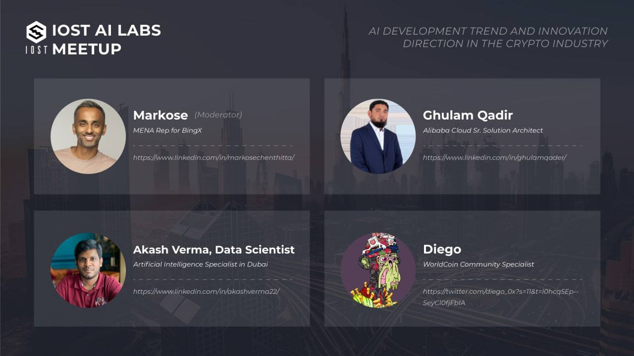 出席本次会议的嘉宾主要有 BingX 中东及北非区域代表 Markose,阿里云高级解决方案架构师 Ghulam Qadir,迪拜人工智能专家及数据科学家 Akash Verma,WorldCoin 社区专家 Diego。