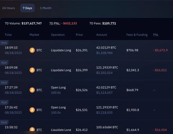 巨鲸100倍杠杆做多比特币BTC ARB爆仓血亏43.2万美金