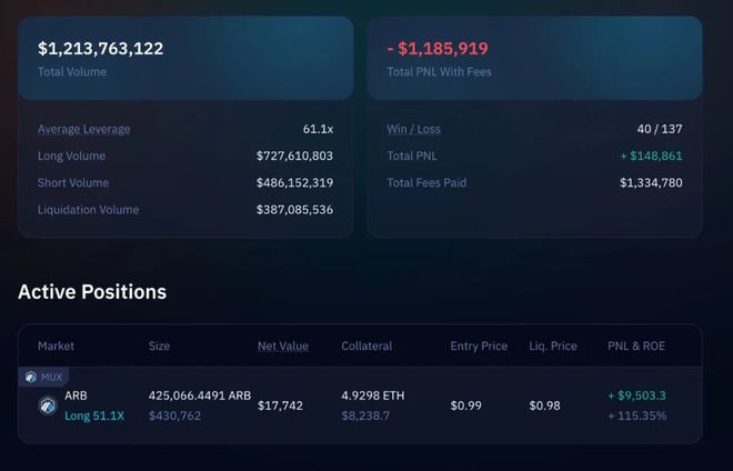 至截稿前,Andrew Kang只剩一张ARB50倍杠杆的多头合约,未实现损益约9,503.3美元,平仓价格落在0.98美