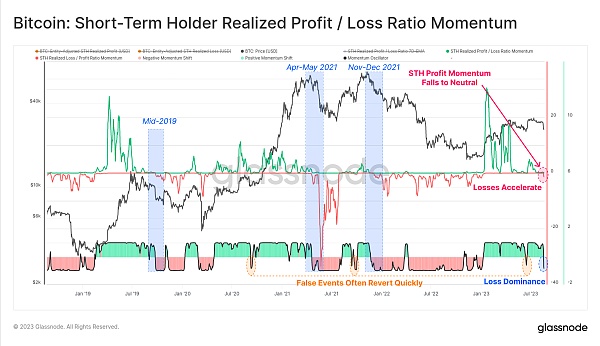 Glassnode 指出,上周的价格下跌“值得密切关注”,并发现 BTC 短期持有者的损失势头和主导地位已经激增。当这种情况发生在 2021 年 5 月和 12 月时,随后 BTC 的价值出现了“更剧烈的下跌趋势”。