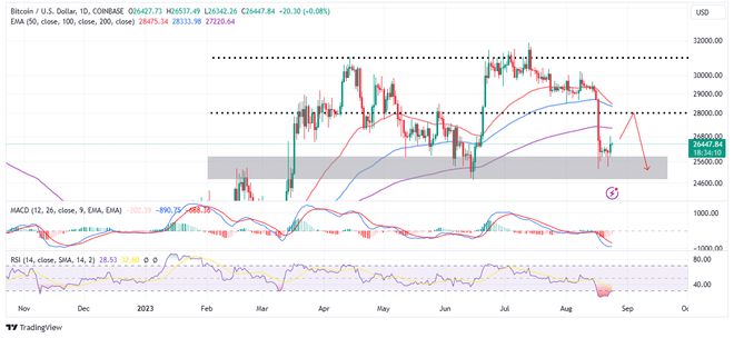 BTC 价格周四上涨 1.7% 至 26,438 美元,试图弥补上周去杠杆化事件带来的损失。在经历了一段较长的低波动期后,最著名的加密货币价格暴跌至 25,000 美元,支撑位为 29,000 美元,阻力位为 30,000 美元。