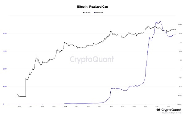 但抛售压力的下滑是否会引发比特币上涨呢?好吧,其中一个可能有发言权的指标是比特币实现上限。已实现上限是通过查看比特币网络上的存储价值来尝试衡量代币价值的一种方法。它还考虑成交量加权平均价格 (VWAP)。