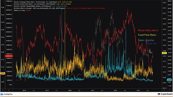 该指标通过测量流入和流出交易所的 BTC 总量来实现这一点。这是根据比特币网络上传输的 BTC 数量来完成的。另一方面,鲸鱼比率是交易所前 10 名流入量与总流入量的比率。
