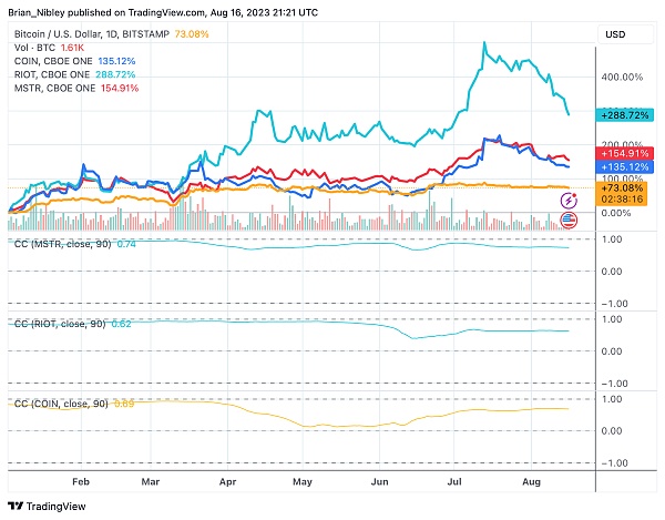 MSTR 的系数自 2022 年 9 月以来已下降到不低于 0.68。RIOT 的系数在 2023 年 6 月下降至 0.75 左右,而 COIN 在 5 月和 6 月一度趋近于 0。