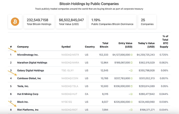 如下表所示,MSTR是持有 152,333 比特币的上市公司中最多的。COIN 以 10,766 比特币排名第四,RIOT 以 7,094 比特币排名第八。