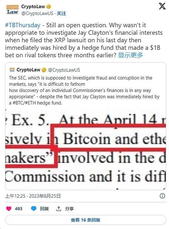 CryptolawUS 是一家专注于加密货币的律师事务所,公开质疑 Clayton 的经济利益以及与竞争对手代币看似复杂的关系。该公司的创始人约翰·迪顿 (John Deaton) 大胆询问为什么不适合调查克莱顿的财务状况,并强调了三个月前对竞争对手代币进行的数十亿美元的押注。
