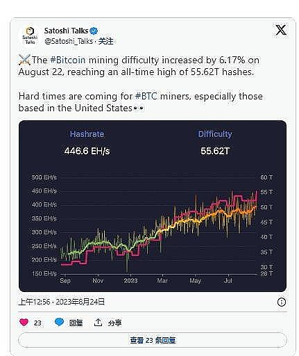 这标志着 2023 年难度第六次大幅上升,强调了矿工信心和网络安全。