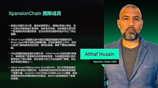 本次大会荣幸地邀请到英国区块链协会名誉主席、XpansionChain的CMO,Althaf Husain先生,将在会上做主题演讲,分享他对元宇宙发展趋势的独特洞察,以及XpansionChain在扩展以太坊的Layer2链方面所取得的突破性进展。他将阐述XpansionChain的技术架构和独特优势,以及如何通过X-Rdllup等创新产品,为元宇宙的落地和发展提供更加稳健的基础。