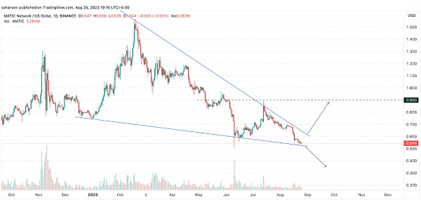 随着 MATIC 价格继续在数月下降楔形内交易,出现看涨逆转的可能性。此外,考虑到当前的市场状况,继续看跌趋势的可能性很大,这可能会拖累价格跌破0.35美元;否则,更高的目标可能会高于 0.9 美元。