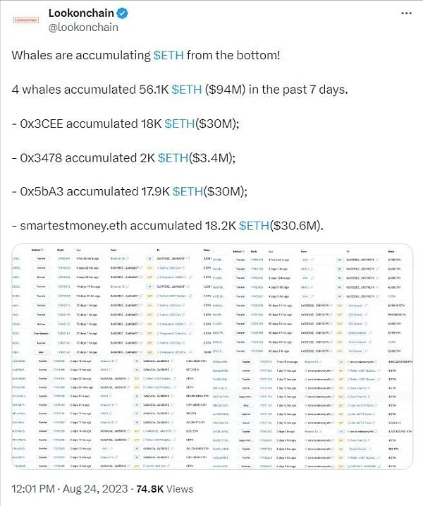 最大的鲸鱼 (smartestmoney.eth) 获得了约 18,200 个 ETH,价值约 3,060 万美元,其次是 18,000 个 ETH,价值约 3,000 万美元,17,900 个 ETH,价值约 3,000 万美元,以及 2,000 个 ETH,价值约 340 万美元。
