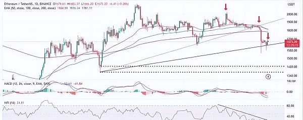 目前 1,600 美元的支撑位已到位,可以吸收抛售压力。较低的上升趋势线强化了这一趋势。尽管如此,考虑到饱受打击的市场结构,目前还不能排除跌至下一个最强劲支撑位 1,400 美元的可能性。