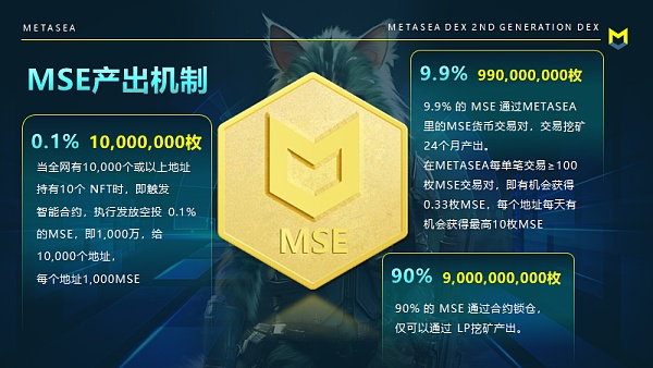 9.9%交易挖矿产出,让每一次交易都有机会赚取MSE。在METASEA DEX,每笔交易≥100枚MSE交易对,您有机会获得0.33枚MSE,每个地址每天最多可获得10枚。