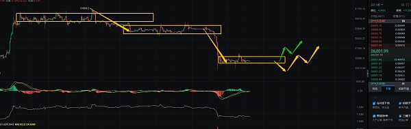 大饼1H的结构,目前的结构走势就是跌一波横一段,基本就是消息驱动市场,整体的话依然还是在这个1H的中枢之中震荡,没有任何方向,只能就是耐心等待,市场的波动率也低,基本没有啥可以操作的空间,如果在往下跌一段的话我个人认为大概率会形成背驰,因为进入笔的下跌是很长的,所以后续如果在往下的话可以短线找支撑在去操作的机会。