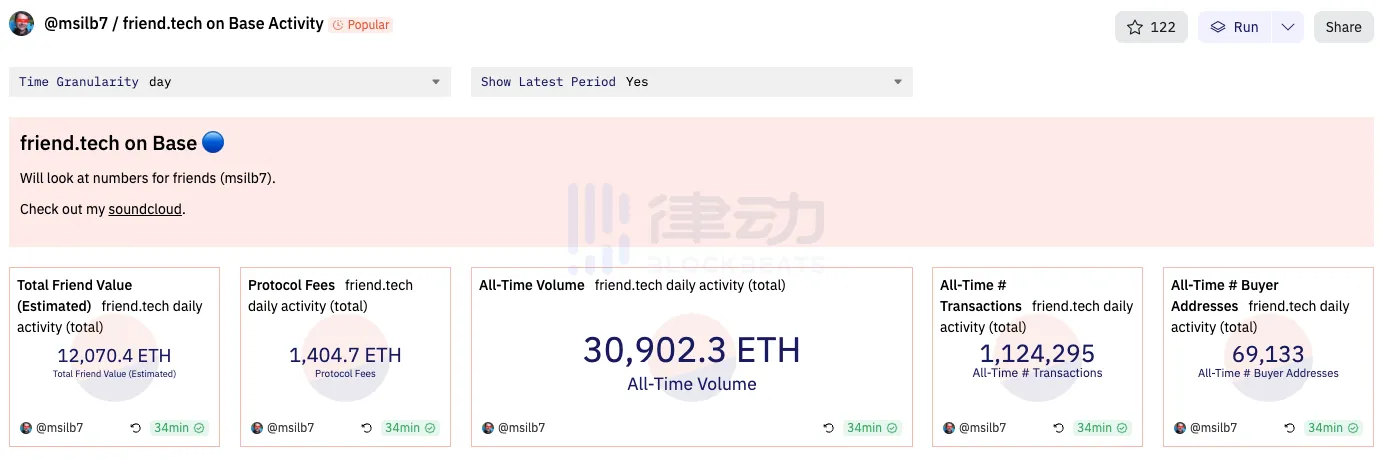 friend.tech 协议分析工具「friend.tech on Base Activity」,该网站提供 friend.tech 用户「账号份额」总市值、协议费用、协议交易总量、总交易数和活跃用户等数据。