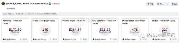 friend.tech 个人用户分析工具「Friend Tech User Analytics」,输入地址就可以查询该用户「账号份额」的总市值、当前供应量、交易量、交易费用、交易次数和参与交易用户数等数据。