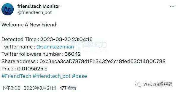 新入驻头部 KOL 可预期的 Share 价格增长,使得专门监控追踪新晋加入平台流量大 V 的 Bot(推特账号 @friendtech_bot)应运而生。