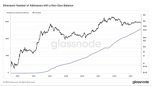 随着 ETH 整体采用率的稳步增长,质押的增加也随之增加。持有正数 ETH 代币的地址数量接近 1.05 亿,标志着自近八年前推出以来的强劲增长轨迹。