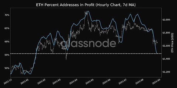 根据 Glassnode 最近的更新,所有 ETH 地址中约有 55.42% 是盈利的,这是过去七个月以来的最低水平。