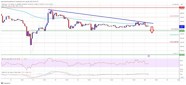 在 ETH/USD 小时图上,一条关键的看跌趋势线正在形成,阻力位在 1,660 美元附近(数据来自 Kraken)。