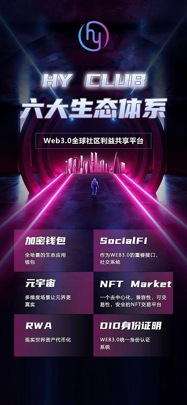 6、RWA:现实世界资产代币化,据了解HY CLUB已经和国际巨头,财团进行合作,将我们的实体资产进行一个token化,RWA将资产代币化,传统金融市场将以RWA的形式持有和交易资产,同时利用 Web3 技术整合同一平台上的多维资产投资,为股票、债券、大宗商品和加密货币等异质资产提供高效的连接机会,并为用户提供 RWA(现实世界资产)资产配置方案。再结合流动性挖矿,创新地改变了项目治理模式,重新定义收益、权益分配方式,为用户增强收益。