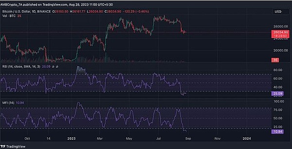 比特币的相对强度指数和资金流量指数分别位于 25.37 和 10.94 的超卖区域。通常情况下,此时预计价格会向上调整,因为卖家常常发现很难进一步降价。