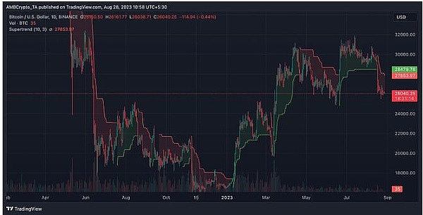 一位加密货币分析师在最近的一条推文中指出,比特币的 [BTC]超级趋势指标最近发出了卖出信号,这表明随着投资者加大代币发行力度,领先的加密货币可能会出现更大幅度的价格调整。