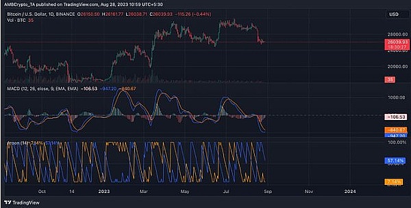 比特币当前市场周期的严重悲观程度怎么强调都不为过。熊市周期由代币的移动平均收敛/发散(MACD)指标确认。它显示 MACD 线在 8 月 17 日资本外逃后穿越趋势线。该指标已被定位并且仅返回红色直方图条。
