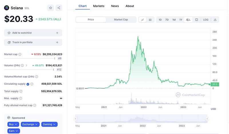 2020年以1.5美金上线,上一个大牛,也就是2021年冲到259美金,当下回落到20美金,SOL,你值得拥有!