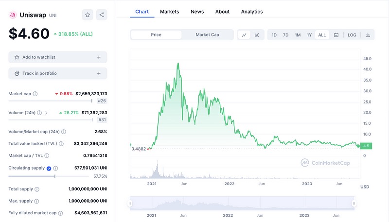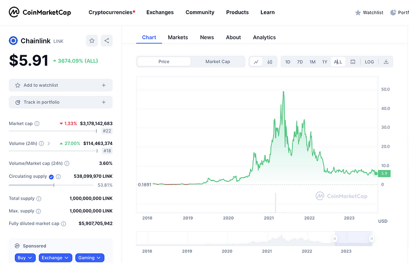 2020年以1.1美金上线,2021年牛市冲到45美金,当下价格5U附近。