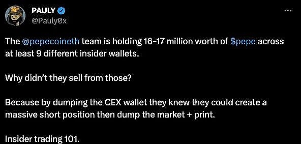 PEPE官方团队本周传出官方倒货事件,官方多签钱包被前团队成员私自登录,窃取了总量为26兆代币中的60%,相当于16兆枚PEPE。