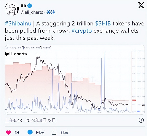 8 月 17 日至 8 月 26 日期间,Shia Inu 持有者已提取 1.8 万亿枚代币,按资产现值计算,价值约为 1,450 万美元。这一事态发展表明,供应紧张可能会再次严重影响柴犬价格。在 Shibarium 担忧消退的情况下,市场需求的增加可能会引发 Meme 币的上涨。