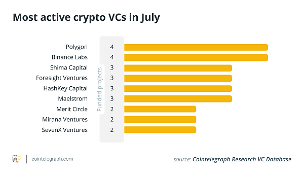 Polygon 和 Binance Labs 在 7 月份参加了四轮比赛。 有趣的是,0xBoost Finance、Aethir、Dappos 和 Delabs Games 吸引了多家知名投资公司的投资,包括 Polygon、Binance Labs、HashKey Capital 等。