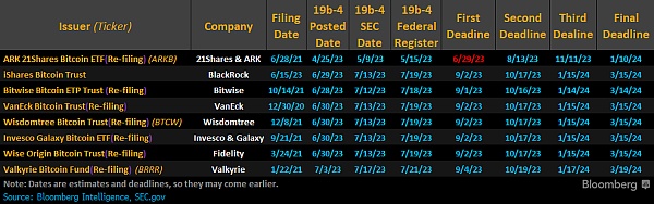 在这一持续的传奇故事取得最新进展之际,美国证券交易委员会面临着一系列迫在眉睫的最后期限。9 月 1 日,投资公司 Bitwise 将了解其拟议的 ETF 是否会获得监管批准。随后,9 月 2 日,业界将密切关注贝莱德 (BlackRock)、VanEck、富达 (Fidelity)、景顺 (Invesco) 和 WisdomTree 等金融巨头正在等待 SEC 对各自基金的裁决(如 SEC 官方文件中所示)。加密货币投资领域的另一位参与者 Valkyrie 也将提心吊胆,直到 9 月 4 日 SEC 将对他们的申请做出回应。