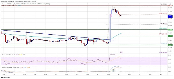 ETH/美元小时图上突破了关键看跌趋势线,阻力位在 1,650 美元附近。该货币对攀升至 1,670 美元和 1,700 美元阻力位上方。然而,空头在 1,750 美元区域附近活跃。