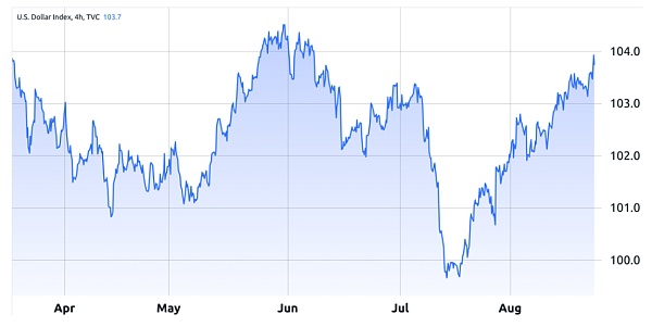 尽管全球经济前景恶化,由于比特币的稀缺性和固定的货币政策,这可能会增强比特币的吸引力,但投资者仍表现出涌向被视为安全的美元的倾向。 美元指数(DXY)的走势就体现了这一点,该指数已从 7 月 17 日的低点 99.5 飙升至目前的 103.8 水平,创下两个多月以来的最高点。