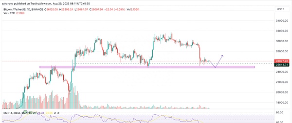 在最近的暴跌之后,比特币价格下跌,目前交易价格接近自 2023 年低点反弹以来一直保持的关键支撑位。长期的盘整预计将把价格拖向略低于 25,000 美元的临时支撑位。