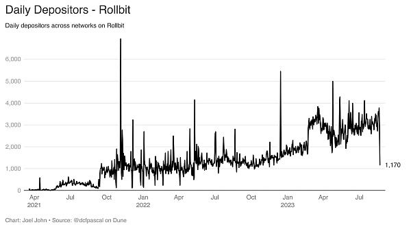 下面的图表显示了过去几个月 Rollbit 上的用户数量。该产品每天都有近 4000 名用户存款。相比之下,OpenSea 每天大约有 6500 名用户。这并不是说 Rollbit 是博彩领域的龙头。相反,它反映了用户是如何从 NFT 转向高波动性产品的。