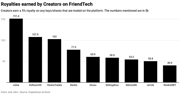 下面的图表显示了过去一周 FriendTech 上排名前的“创作者”赚了多少钱。