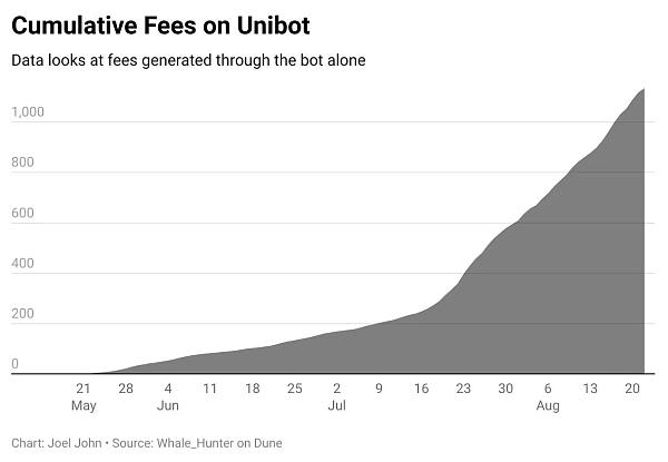 Unibot 上的平均用户每天产生约 2600 美元的交易量;每笔交易约为 600 美元。在某一天内,共有 3400 名用户通过 Unibot 进行交易。这与我们通常在交易所看到的数字相去甚远,但自今年 5 月以来,它已经产生了近 200 万美元的费用。