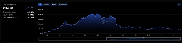 DeFi 流动性处于自 2021 年 2 月以来的最低水平。众所周知,高利率环境使得追求链上收益变得不那么吸引人。加上加密货币价格下跌,导致了 TVL 的新低。
