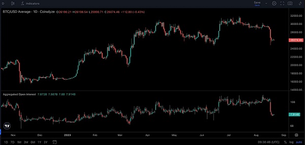 从 Coinalyze 上的下图可以看出,8 月 17 日,大部分期货未平仓合约被清空,导致多头头寸大量清算。加密货币的波动性在过去几周一直非常低,当这种情况发生时,随着波动性的回归,期货交易者会增加开仓利益,以押注市场的走势。当价格开始下跌时,大量多头仓位被强制平仓,进而导致更多仓位被清算,如此循环。因此,很难将最近的价格行动归因于任何特定的消息。此外,现货市场进一步出现大量抛售,这可能表明较大的参与者正在抛售头寸。