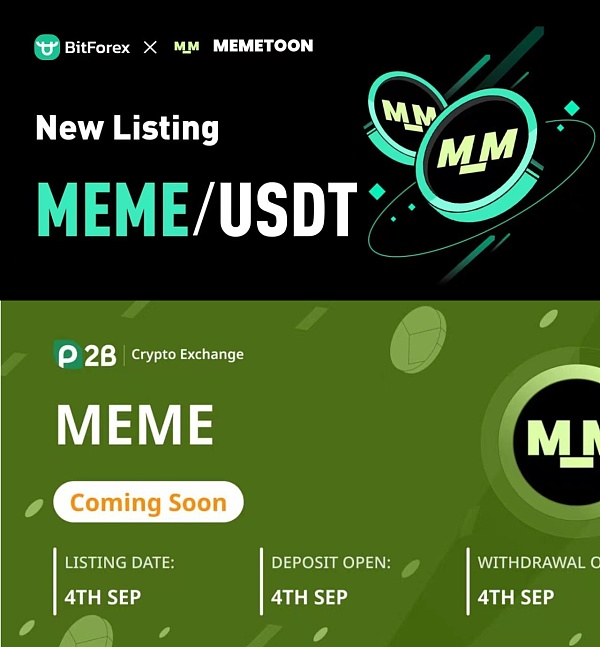 2023年9月4日,MEME代币将在P2B交易所和BitForex交易所同时上市,并计划在9月初在Lbank上市。 为了纪念这一事件,MEMETOON计划举办一项特殊活动,并在2023年赠送NFT作为回馈给用户。