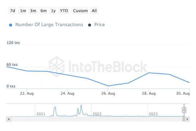 看起来模因币在这次交易中几乎没有变动。截至发稿时,SHIB 的交易价格为 0.000008165 美元,日跌幅为 1.10%。该资产从高点 0.000008264 美元一路下跌至低点 0.000008107 美元。此外,也没有其他大额交易。根据IntoTheBlock的数据,大额交易数量降至16笔低位。