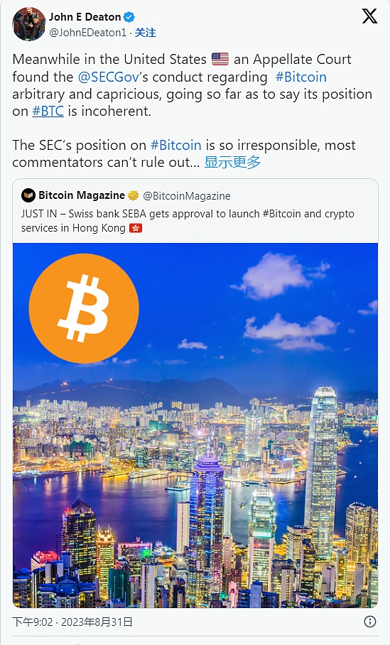 Deaton 是一家加密货币律师事务所的创始人,他在最近的一条推文中强调了美国的情况,并将其与 SEBA 在香港的成功进行了比较。Deaton 强调,美国哥伦比亚特区巡回上诉法院裁定 SEC 拒绝 Grayscale 将其 Grayscale 比特币信托 (GBTC) 转换为现货比特币 ETF 的申请是“任意且反复无常的”。法院进一步宣布 SEC 对比特币的立场“不连贯”,表明 SEC 拒绝灰度申请的论点是矛盾的,缺乏逻辑一致性。